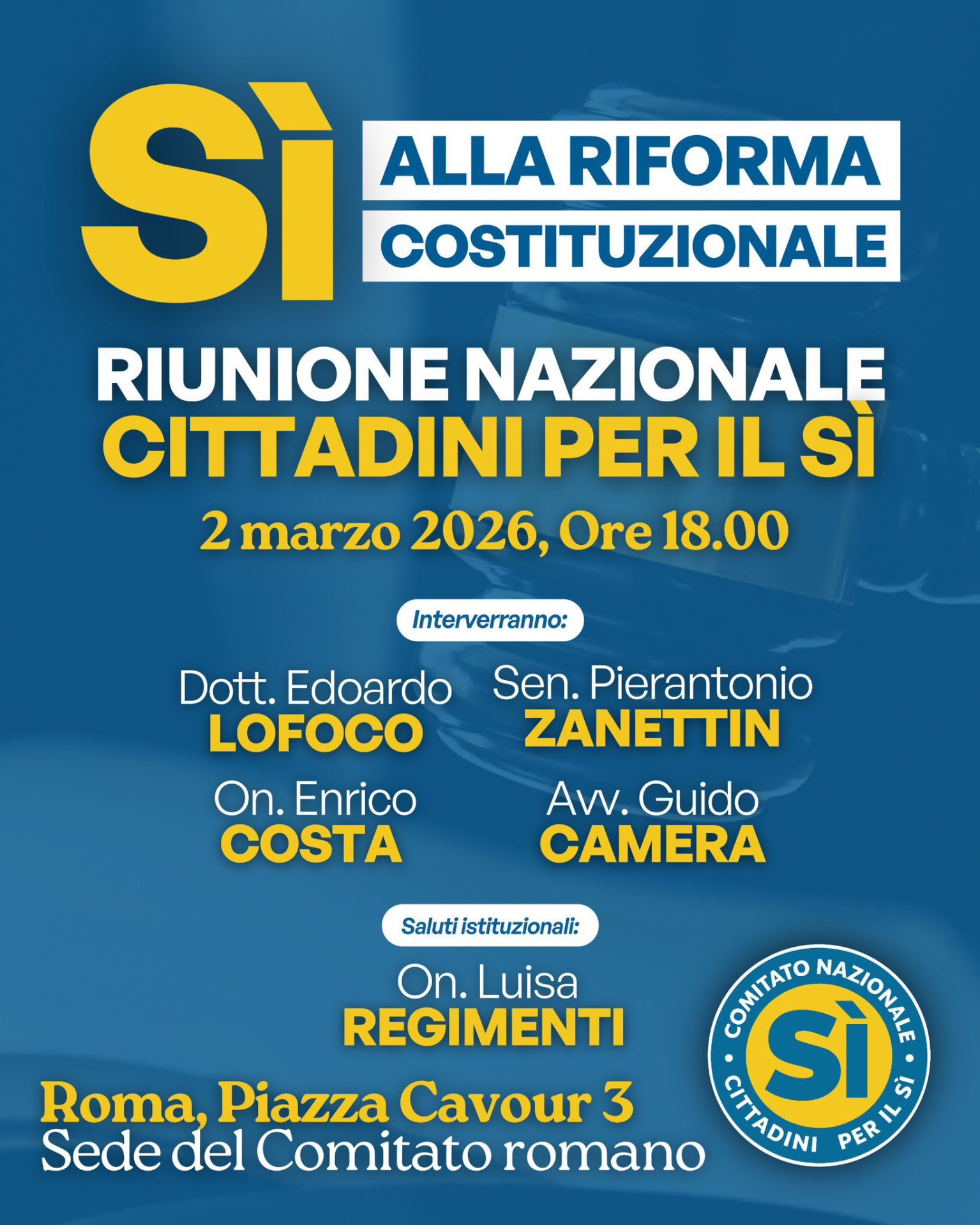 Lunedì 2 Marzo alle ore 18:00 ti aspettiamo nella Sede del Comitato Romano in Piazza Cavour 3, per la Riunione nazionale Citaddini per il Sì. Sarà un momento di confronto e condivisione per sostenere la riforma della Giustizia.